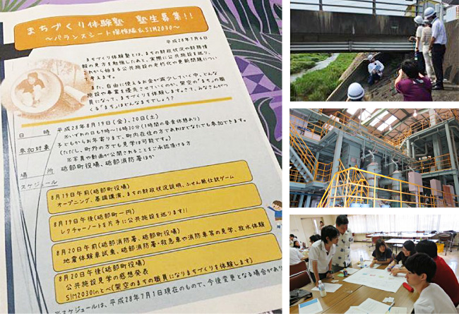 「まちづくり体験塾」の一環として、2日間にわたって施設見学が行われるとともに、参加者が町の行政における様々な分野の責任者になって、事業の選択を行い、「まちづくり」をしていくシミュレーション「SIM 2030 in とべ」が実施されました。
