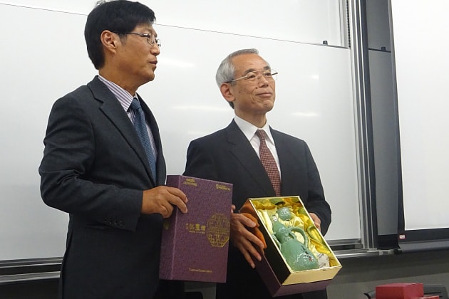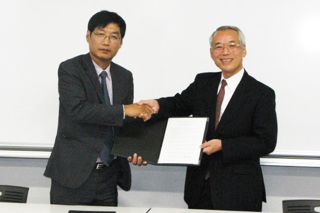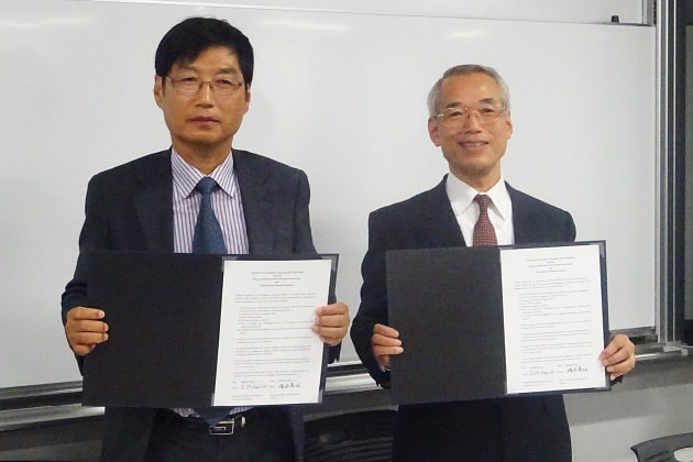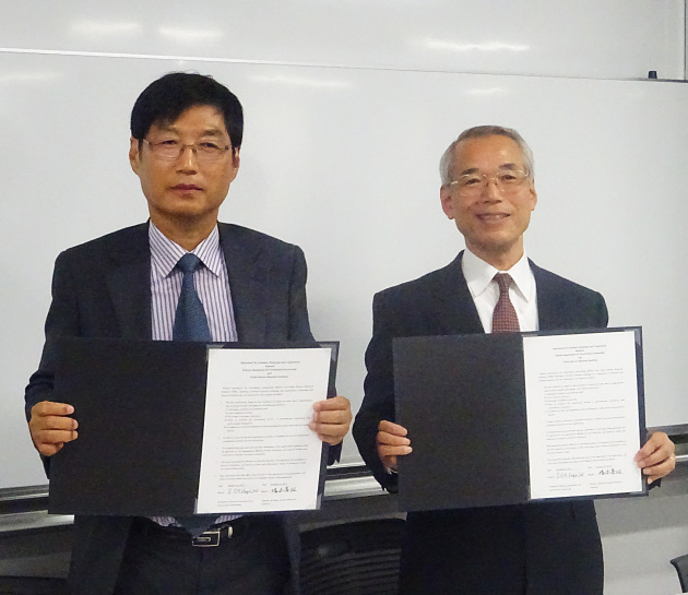 早稲田大学パブリックサービス研究所塚本壽雄所長とKAGA姜仁載会長の間で連携協定書の