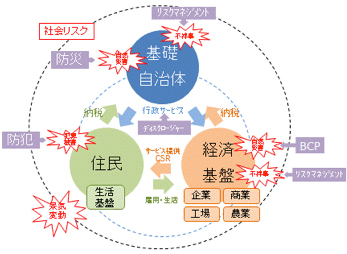 もっとも自然災害の発生、行政サービスの低下など、いわゆる社会リスクが顕在化した場合には、経済基盤となる企業や住民が移転等により、この3つの関係を保持することが難しくなる。